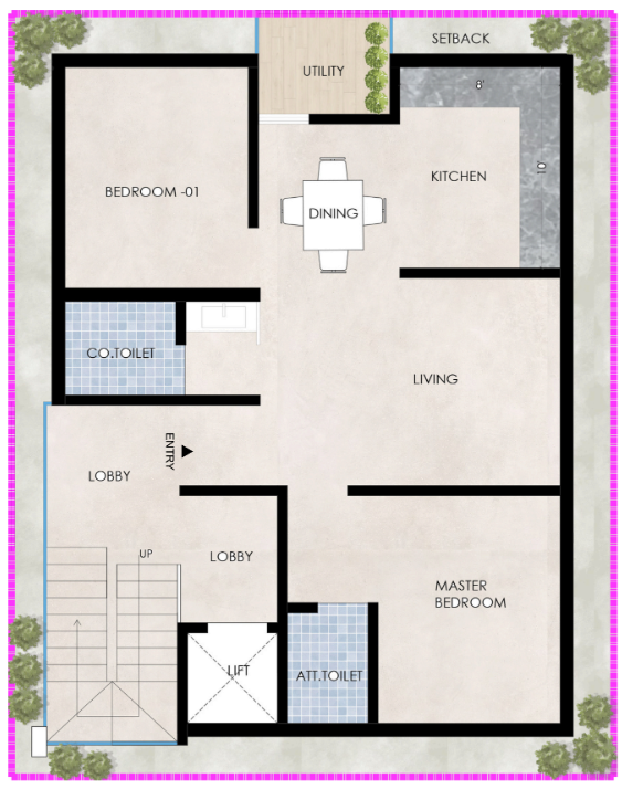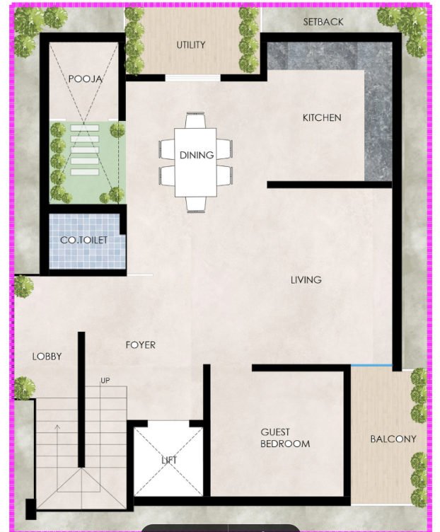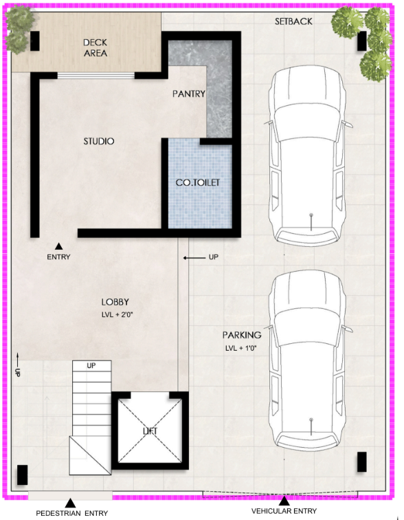 The ground floor is thoughtfully planned to streamline vehicular and pedestrian movement, ensuring clarity, safety, and convenience within this Contemporary House Design. It includes: