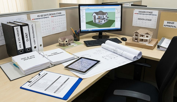 On average, constructing an independent house in Bangalore takes 10 to 14 months, including planning, approvals, and construction for a G+1 residential building. Timelines may vary based on design complexity and approvals.