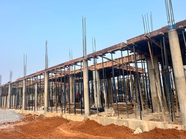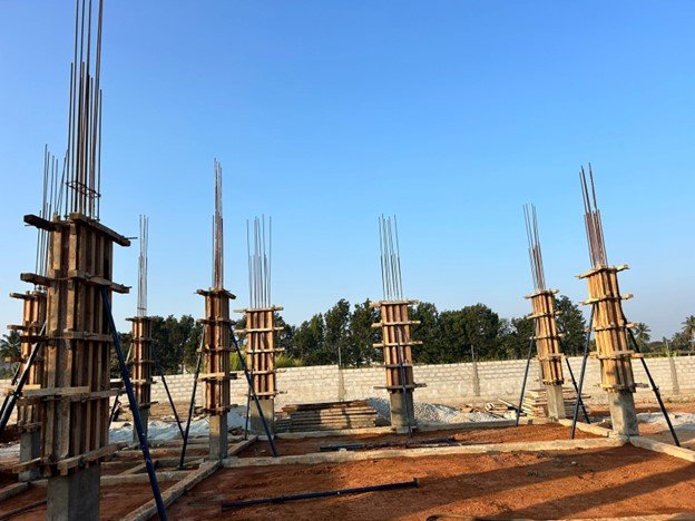 A minimum period of curing is required for the PCC, after which footings and columns are extended from the base. The beams connecting each column extension from this make the plinth or the ground floor profile of the house.