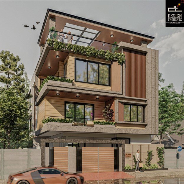 The architectural composition is a testament to our ability to balance boldness and warmth perfectly. Large openings, framed in dark-toned trims, ensure abundant daylight and cross-ventilation. Vertical wooden screens add texture, privacy, and solar shading, while the projecting balconies wrapped in planter beds soften the overall form.