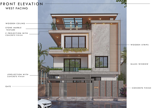 • A west-facing house plan 40 x 50 Vastu, that is designed in a modern style, as it explores a combination of raw textures and modern design elements. The G+2 abode is also a statement for contemporary elevation tucked in the city.